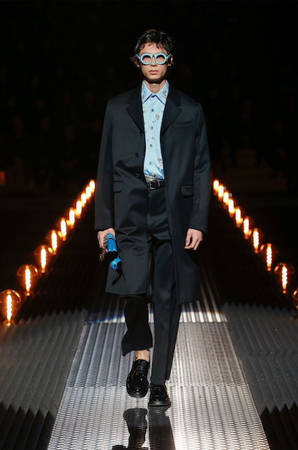 La suggestione comincia già dall’allestimento della sfilata: un tappeto di lampade dalle luci calde che illuminano il buio circostante chiuso in un perimetro fatto di pareti di gommapiuma scura. La firma dello spazio è sempre quella dello studio AMO di Rem Koolhaas e ben allude al mondo ovattato e buio di tanta umanità solitaria e indifesa. Sono concetti profondi quelli sottesi alla nascita della collezione Prada per il futuro autunno inverno 2019 2020.