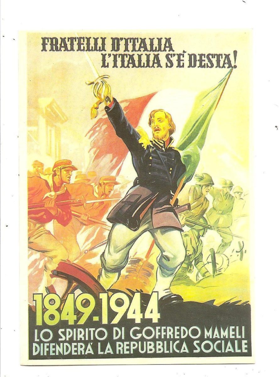 Manifesto della RSI con riferimento all’inno di Mameli riabilitato dal fascismo antimonarchico e repubblicano