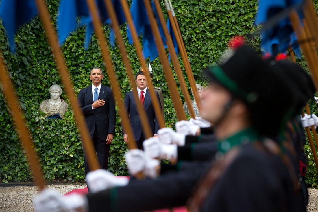 2014: Renzi e Obama durante l’esecuzione degli inni nazionali a Villa Madama