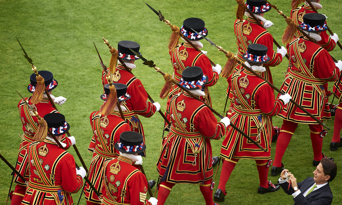 23 maggio 2017. Gli Yeomen Warders, i “guardiani della torre di Londra” marciano durante lo Special Garden Party nei giardini di Buckingham Palace, nella capitale britannica.