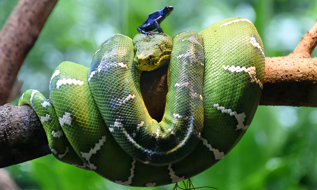 24 maggio 2017. Un esemplare di Dendrobates tinctorius, conosciuto con il nome indio di okopipi, poggiato su boa arboricolo smeraldino (Corallus caninus) allo Zoo di Singapore.