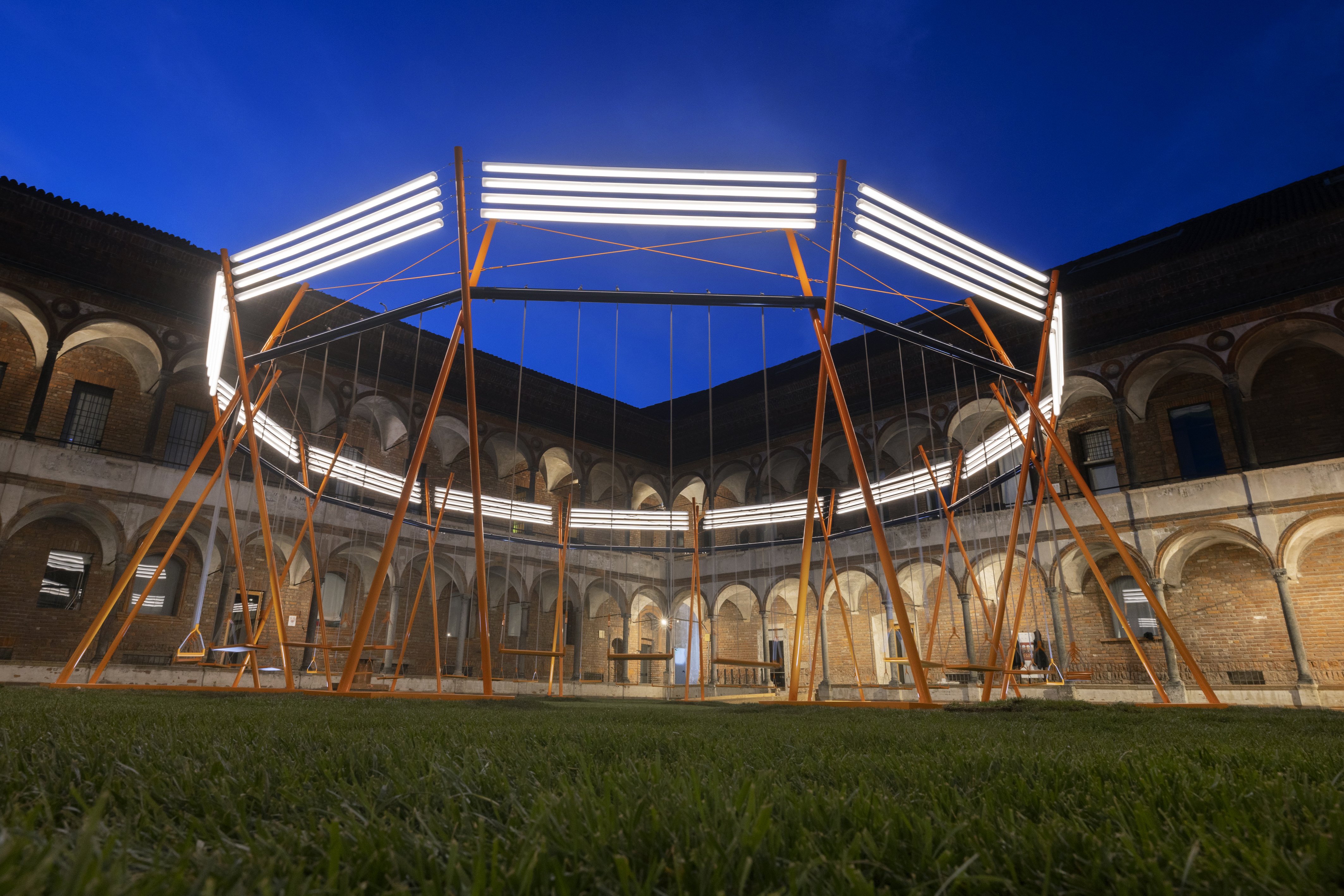 Siamo partiti cercando di capire quale potesse essere il modo giusto per intervenire in un contesto magnifico come il Cortile della Farmacia. L’altalena riporta in una dimensione giocosa e anche un po’ di rischio. Oggi disegnano le altalene per avere la massima sicurezza, con un sistema di protezione. Un tempo nei parchi giochi le altalene erano così, come la mia Swing. In scena abbiamo portato anche il suo tipico movimento, vedendoci attraverso l’oscillazione della vita. Pensate al mito greco in cui si parla di oscillazione tra vita e morte, tra natura e artificio.