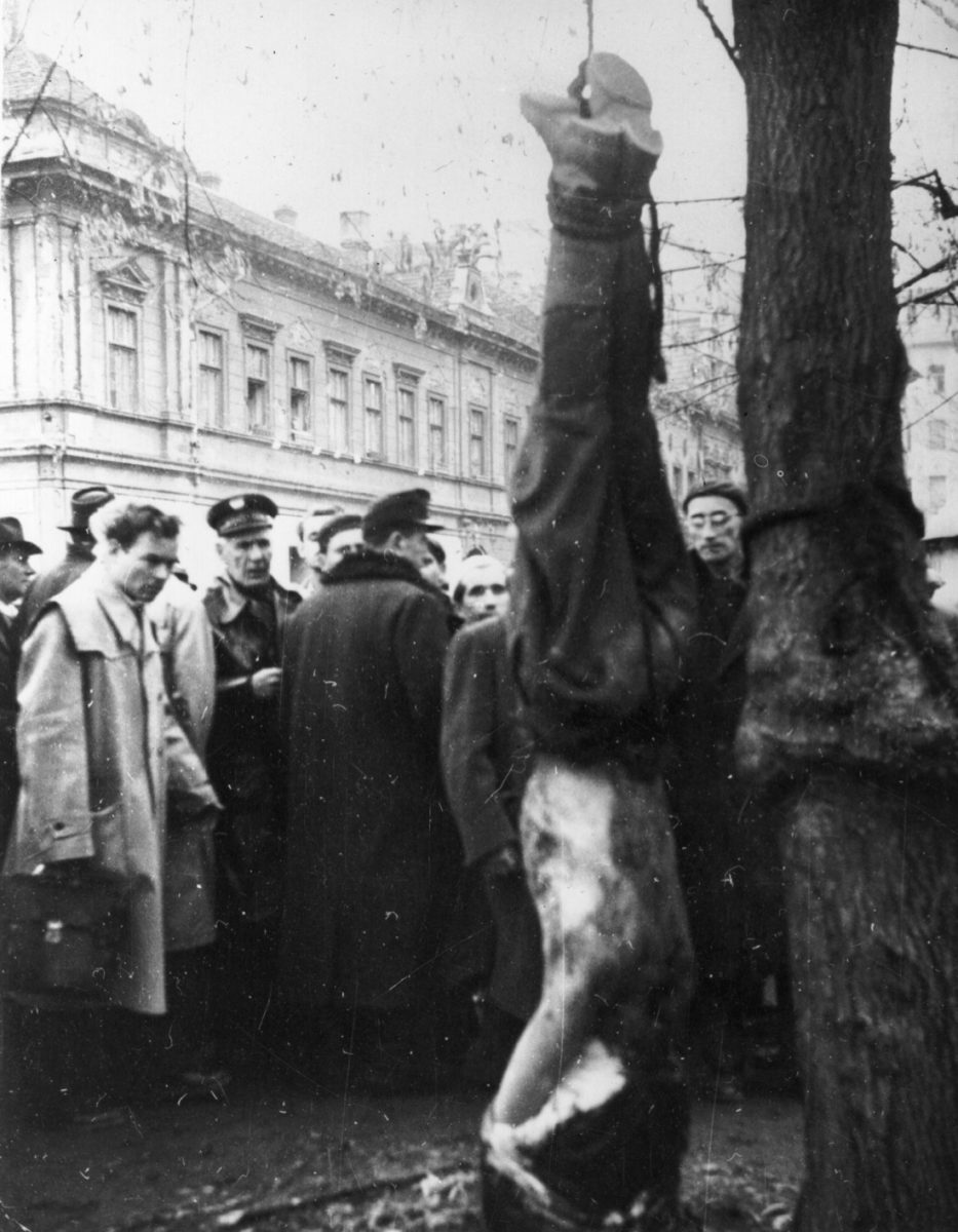 1 novembre 1956. Un agente della polizia segreta ungherese AVH linciato e appeso ad un albero durante la rivolta.