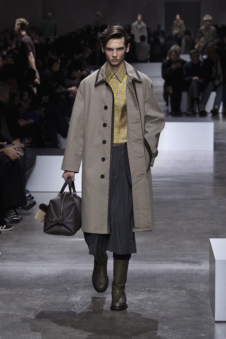 Per il prossimo autunno inverno Silvia Venturini Fendi gioca sulla dualità dell’urbano e del bucolico partendo dall’iconografia del kilt scozzese che perla l’intera collezione, declinato in lunghi short plissettati indossati con stivali Wellington in pelle e calzini da trekking, gonne plaid o classici pantaloni rivisti con pieghe lungo la gamba.