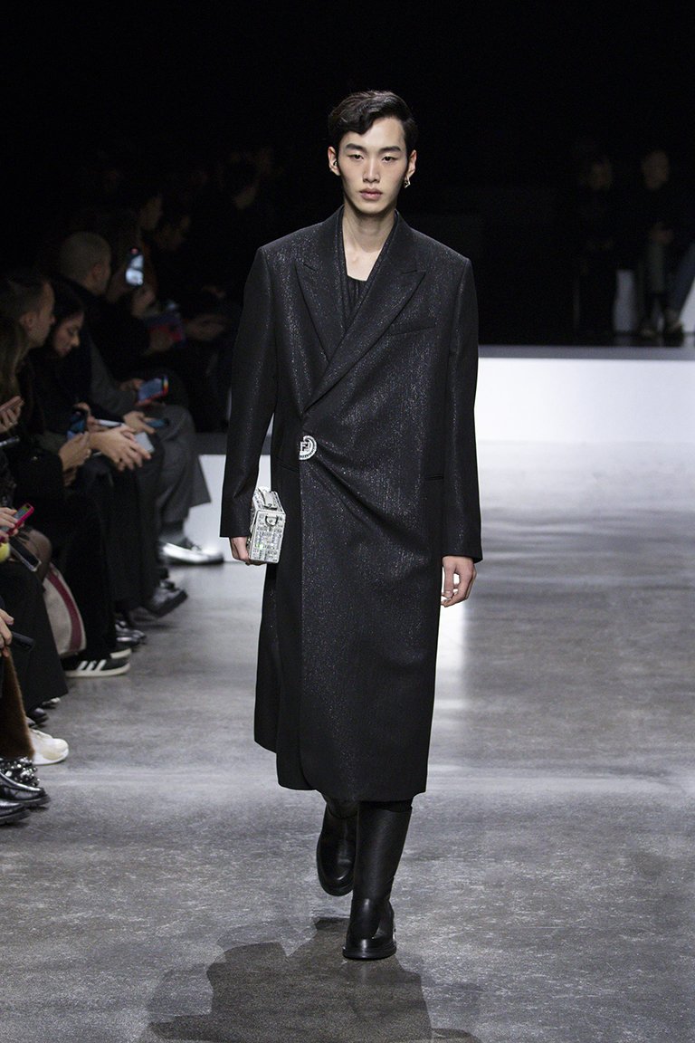 Le generose silhouette dei capispalla, con spalle raglan e bottoni in pelle, sono arricchite da colli in pelle Selleria e accenti contrastanti in camoscio effetto velluto a coste. Ci sono cappotti stile pescatore e giacche cerate impermeabili in tela FF side-by-side con opulenti giacche bomber e caban con profili e cuciture in shearling rasato trompe l’oeil. La maglieria color-block esalta i giocosi particolari della sartoria, dalla lucentezza di maglie a trecce pressate a caldo a cardigan avvolgenti a costine e orli triplicati o polsini su maglie polo e gilet. Il savoir faire decennale di Fendi si mescola a tecniche nuove in risposta al panorama in continua evoluzione della sartoria.