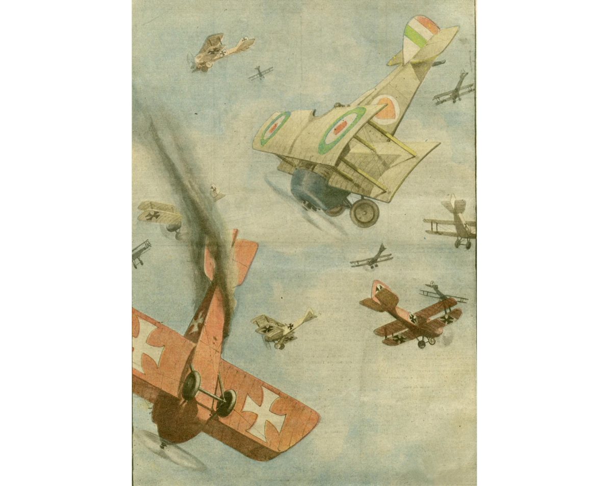 L’ illustrazione di Achille Beltrame che racconta l’impresa di Ernesto Cabruna. Da solo contro dieci, riuscì ad abbattere due velivoli e a mettere in fuga la formazione. (Getty Images)
