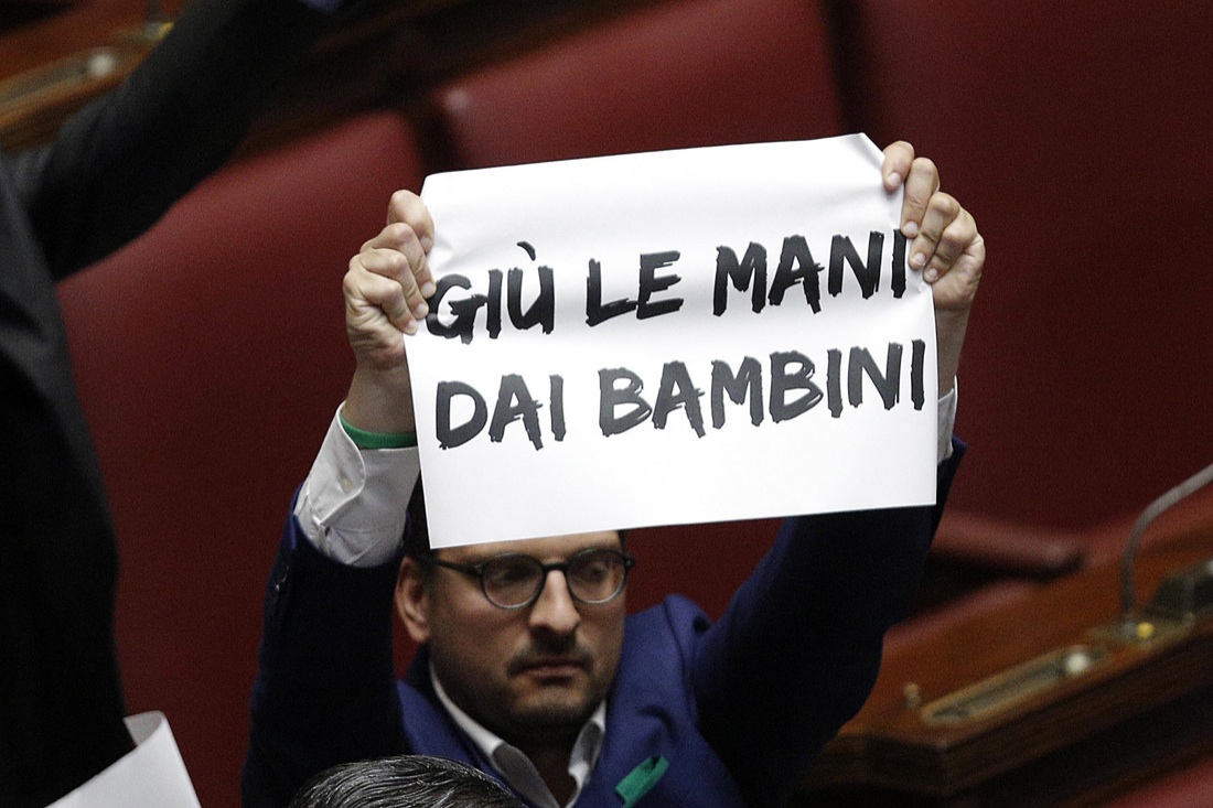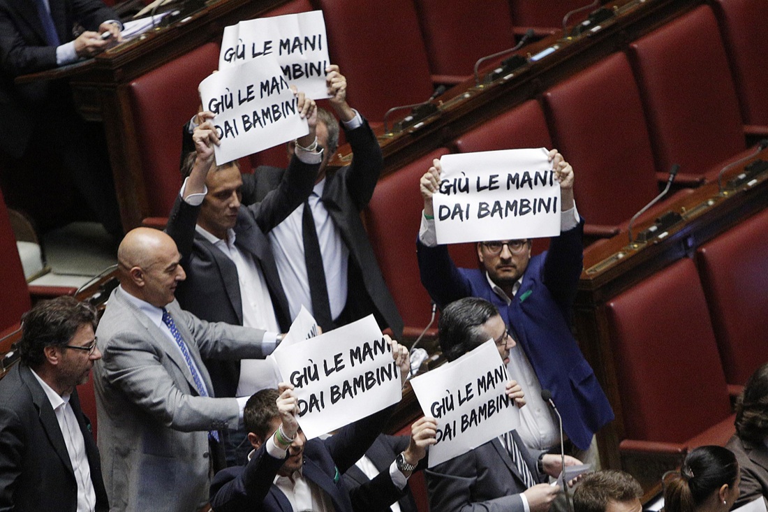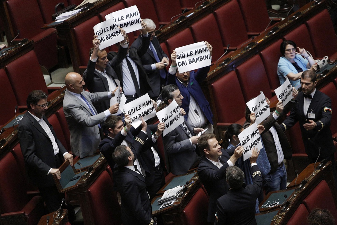 Argomenti che non hanno convinto le opposizioni. Secondo le minoranze la “Buona scuola” resta un bluff sul piano delle assunzioni, considerate solo “virtuali”, e un pericolo per la libertà d’insegnamento e gli altri principi costituzionali che sarebbero stati compromessi dal ddl. Anche questa mattina ci sono stati momenti di tensione quando il vicepresidente della Camera, Roberto Giachetti, ha dovuto sospendere brevemente la seduta ed espellere il capogruppo della Lega Nord, Massimiliano Fedriga, esortato a bloccare l’esposizione di cartelli con la scritta “Giù le mani dai bambini” mostrate dai suoi colleghi di partito contrari all’introduzione della cosiddetta “teoria del gender”. Cartelli sono stanti esposti anche dai banchi di Sel (“Oxi alla ‘buona scuola’ di Renzi”) che ha votato contro come pure il M5S.