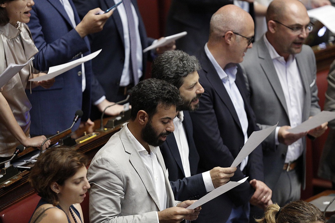 Deputati M5S leggono articoli della Costituzione alla Camera durante voto finale sul DL ”Riforma della scuola”, Roma 9 Luglio 2015, ANSA/GIUSEPPE LAMI