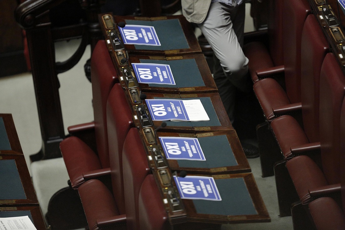 Sel espone nell’Aula della Camera i suoi cartelli durante le dichiarazioni di voto finali sulla riforma della scuola. I cartelli di Sel hanno la scritta in grande ‘OXI’, ovvero ‘no’ in greco, lo stesso no che ha prevalso al referendum di domenica scorsa, Roma 9 Luglio 2015, ANSA/GIUSEPPE LAMI