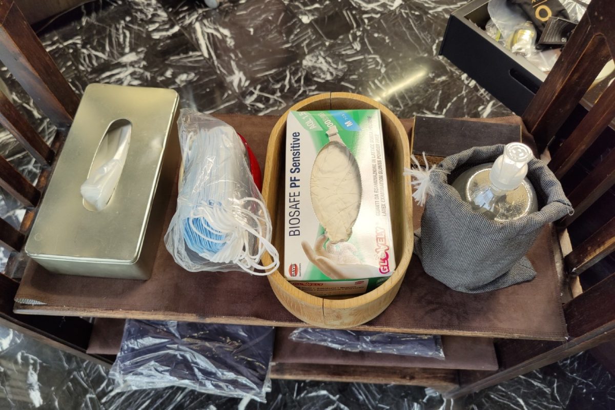 All’ingresso ci sono guanti, mascherine, disinfettante per le mani, kimono per coprire i vestiti (in basso).