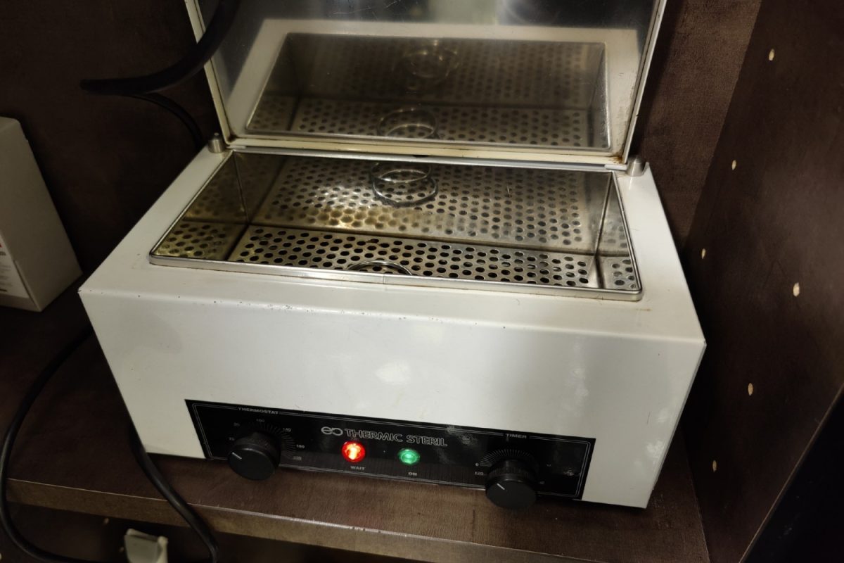 Uno sterilizzatore termico. Prima di riporre gli utensili al suo interno, vengono igienizzati uno a uno con un disinfettante.
