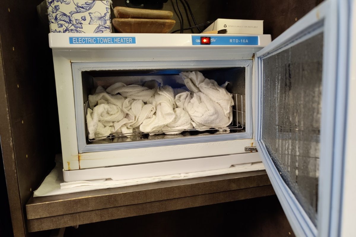 Uno strumento per riscaldare gli asciugamani, prima sterilizzati.