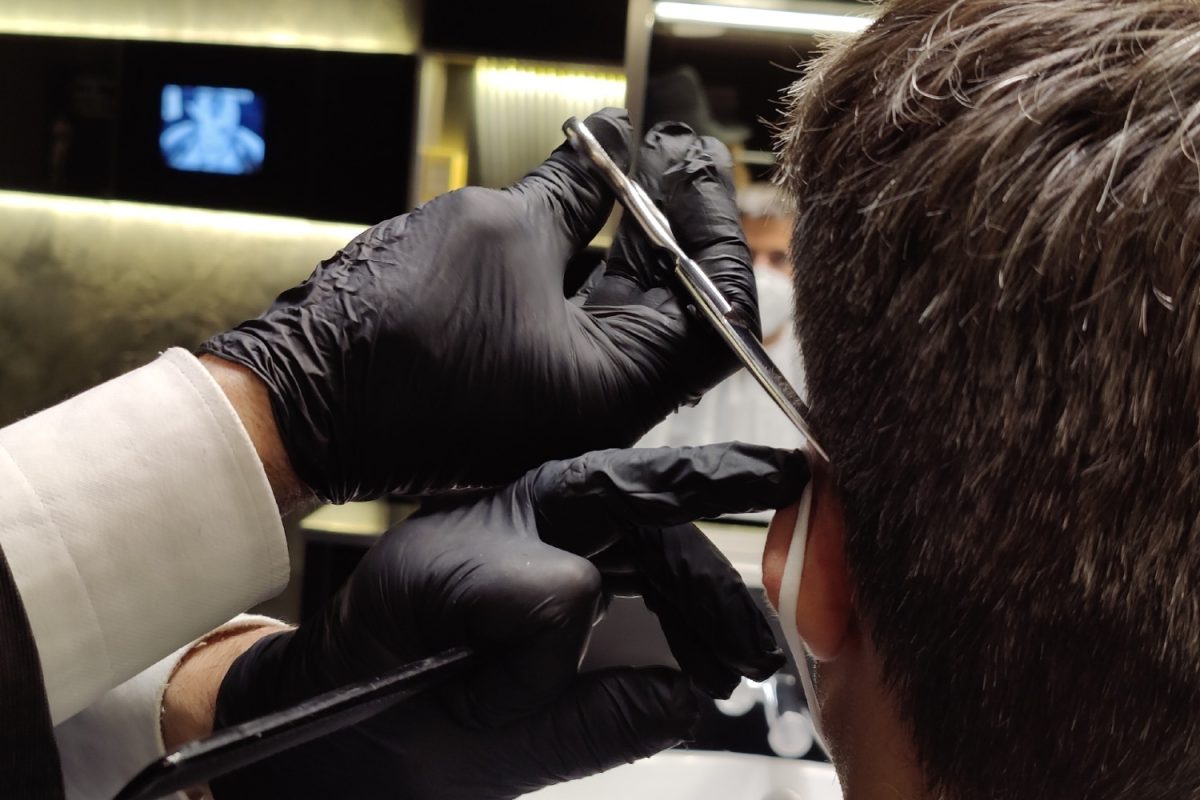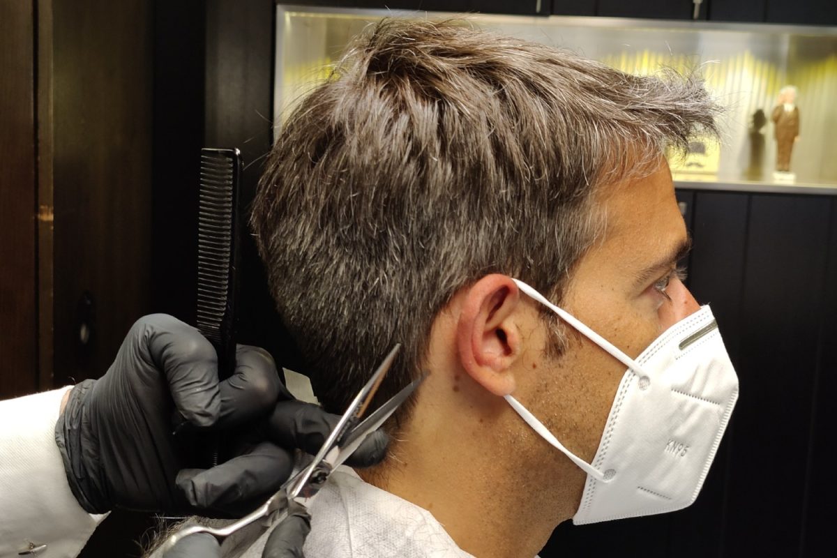 Una fase del taglio. Il cliente indossa la mascherina, così come il barbiere, che ha guanti neri e opera mantenendo un metro di distanza.
