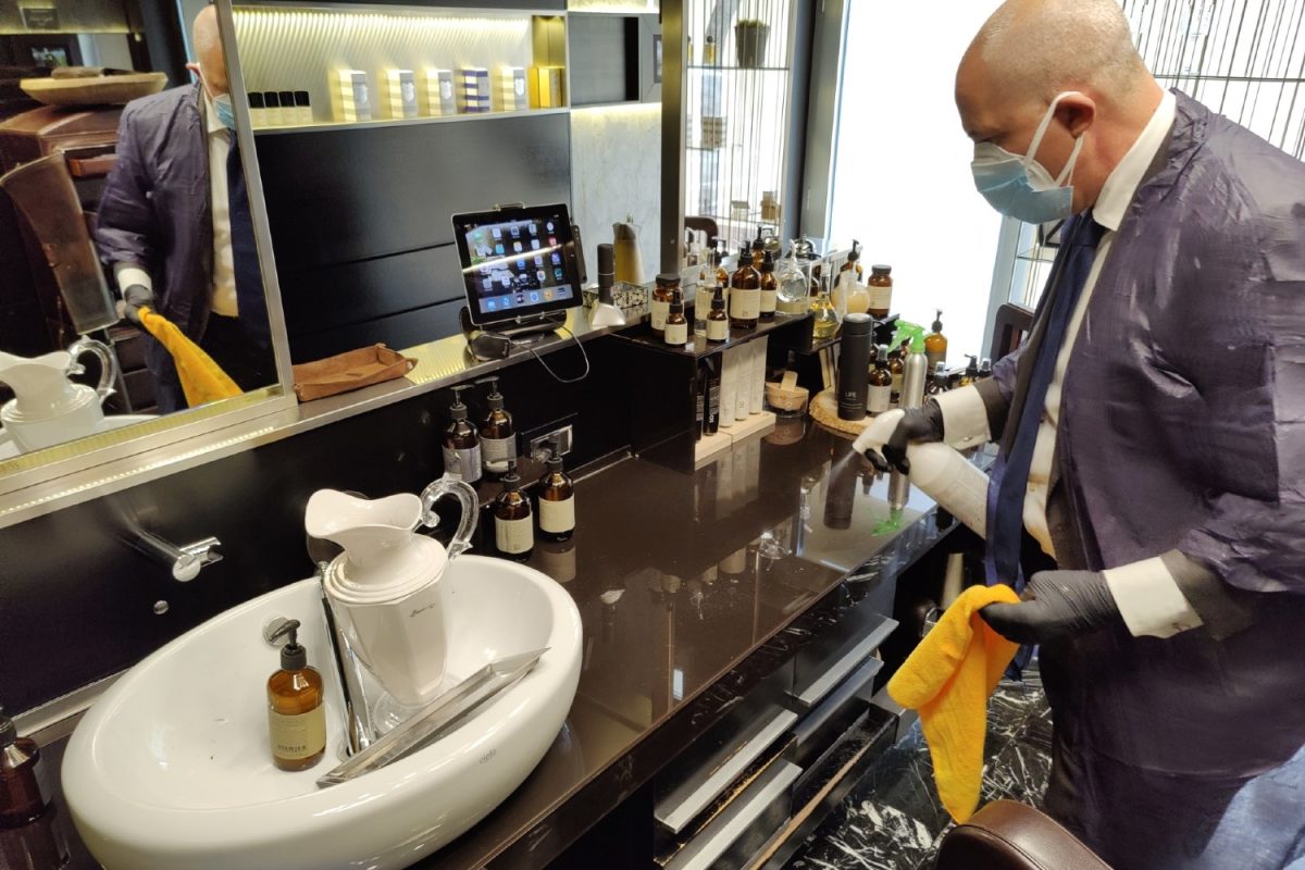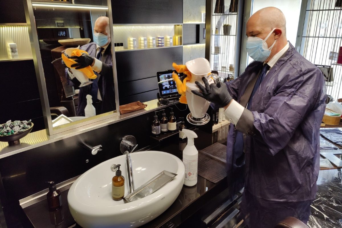 Sarà l’ansia da prestazione, ma il barbiere continua a igienizzarsi le mani. Pardon, i guanti, neri, che indossa sin dall’inizio. Finalmente, il taglio può cominciare, prima con un tocco di macchinetta (c’è parecchio da sfoltire), poi a colpi di vari tipi di forbice. È il momento di fare due chiacchiere: «Gli ospiti vorranno essere al centro del servizio e non sentirsi usati dai servizi. Avranno il desiderio di essere dentro il loro tempo, con i ritmi riscoperti in questo periodo» mi spiega Cirignotta, che ha il pregio di essere un abile conversatore con lampi da filosofo. Basta incalzarlo un po’, per fargli ammettere la sostanza, sancire quello che è evidente: il suo lavoro dovrà cambiare profondamente. Se prima dedicava una mezz’ora in media a ogni cliente, ora servono 45 minuti abbondanti. Se prima poteva farli accomodare nella sala d’aspetto dall’ingresso principale, ora dovrà chiedergli di entrare da un giardinetto sul retro e restare lì non solo finché l’ospite precedente sarà andato via, ma finché tutto non sia stato pulito e sanificato. E tutto quel materiale, dalla mascherina ai calzari per coprire le scarpe, dal kimono alla biancheria, ha un prezzo. Se vale per un nome d’eccellenza che può permettersi un listino più alto, figuriamoci per chi non ha il suo blasone e i suoi spazi.