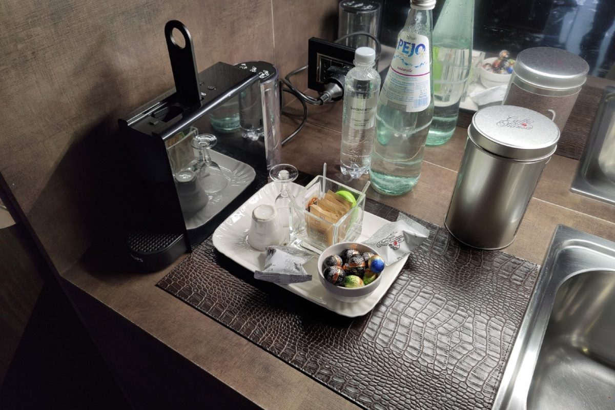 Ci si può anche preparare un caffè. Tutto è fatto in modo che il cliente possa essere autonomo e servirsi da solo. Il vassoio e tutto il kit saranno lavati e igienizzati dopo un eventuale uso. Lo stesso se il cliente avrà bisogno di andare in bagno.