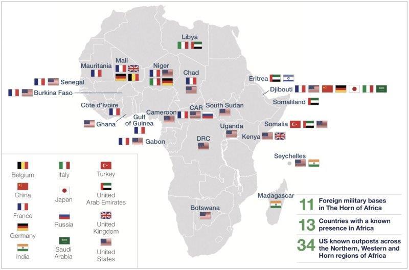 I cinesi in Africa impiegano un numero di lavoratori sconosciuto ma che secondo le stime degli analisti dovrebbe aggirarsi attorno a 200.000 persone delle quali 130.000 tecnici e i restanti probabilmente militari (cinesi, contractors e africani da loro addestrati), tra Tanzania, Djibouti, Etiopia, Kenya, Algeria, Angola, Mozambico, Nigeria, Somalia, Zambia, Sudafrica, Sudan e Sud Sudan. Gli aiuti cinesi, sotto forma di prestiti finanziari e sviluppo di infrastrutture sono spesso criticati e considerati “predatori” proprio perché finalizzati alla ricerca di Pechino delle risorse naturali e l’affermazione come potenza globale. La Russia, dalle basi di Tartus e Port Sudan, è invece il primo fornitore di armi e consiglieri politici ai paesi africani ma anche il cliente di contratti redditizi per importare risorse naturali a costi contenuti cercando anche di sfruttare i rapporti commerciali per ottenere benefici geopolitici. come l’accesso a determinate regioni dominate da milizie senza subire attacchi o episodi di rapimento dei suoi operatori. Se in Tunisia, Egitto, Uganda e Libia la Russia opera sotto la forma di accordi per la cooperazione agricola, in Nigeria, Ghana, Camerun, Repubblica del Congo, Sudafrica, Sud Sudan e Mozambico offre aiuto per l’estrazione di risorse energetiche, di quelle minerali in Angola e ufficialmente di donazioni mediche in Uganda, Guinea e Angola.