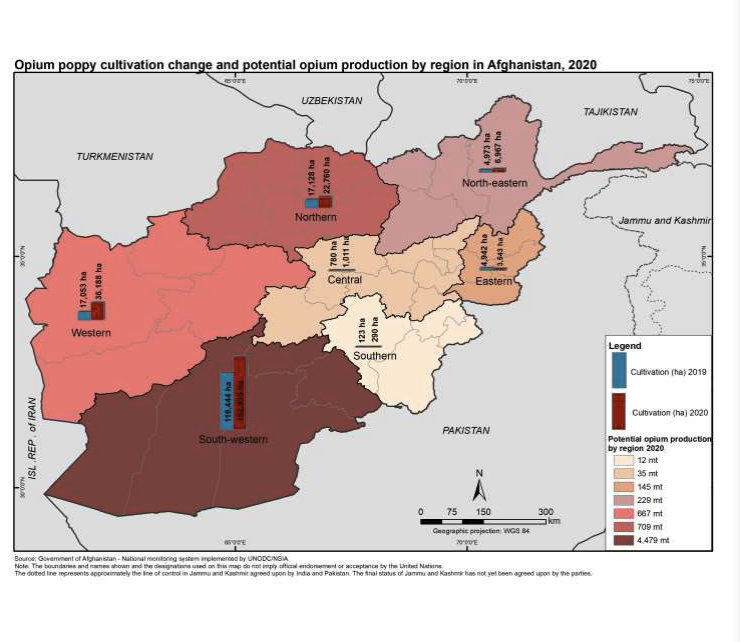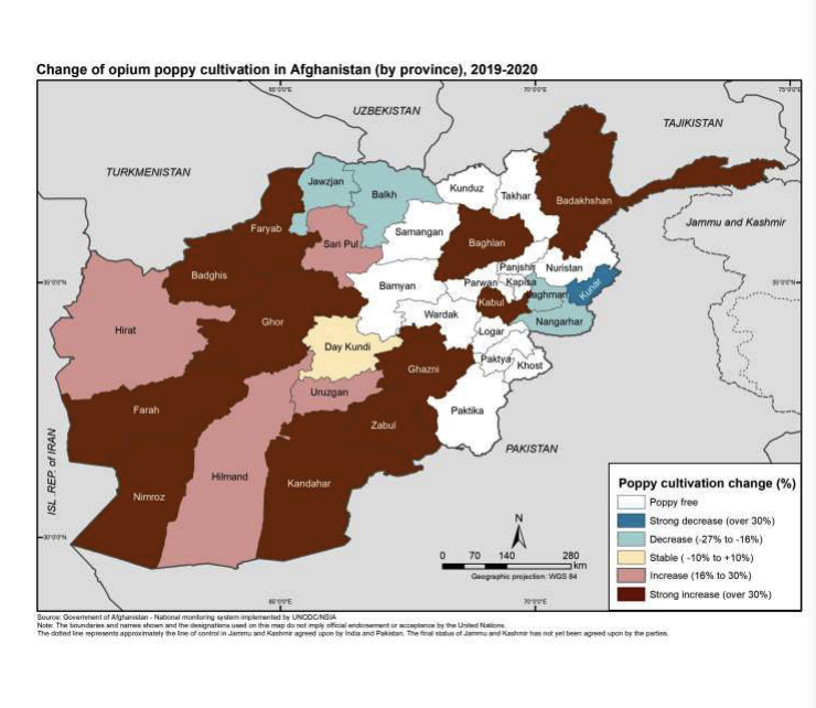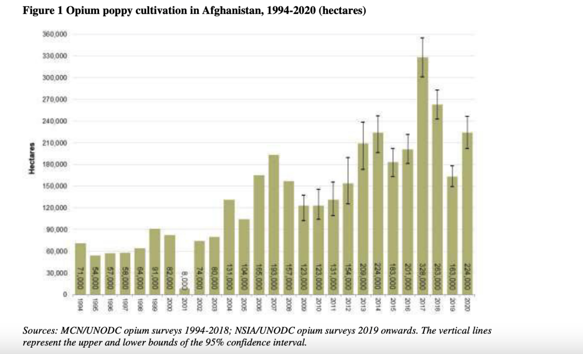 Secondo l’Afghanistan Opium Survey 2020 pubblicato lo scorso maggio «La superficie totale coltivata a papavero da oppio in Afghanistan è stata di circa 224.000 ettari nel 2020, con un aumento del 37% o 61.000 ettari rispetto al 2019,. Con 224.000 ettari, l’area coltivata è stata una delle più alte mai misurate. Mentre l’area coltivata è aumentata in modo significativo in tutte le principali province di coltivazione del papavero da oppio, la regione sud-occidentale è rimasta la principale regione produttrice di oppio del Paese, rappresentando il 71% della produzione totale di oppio in Afghanistan».