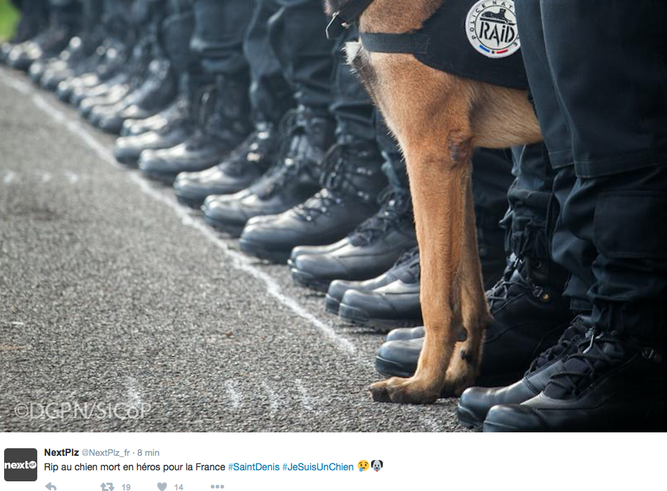 Parigi, 18 novembre 2015. Dopo il blitz a Saint-Denis, su twitter con l’hasthag #JeSuisUnChien si annuncia la morte di un cane delle forze speciali