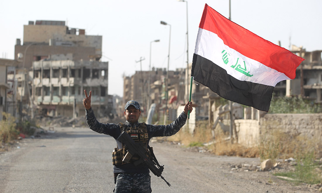 9 luglio 2017. Un soldato della polizia federale irachena fa sventolare la bandiera nazionale festeggiando la definitiva sconfitta dell’Isis a Mosul, in Iraq.