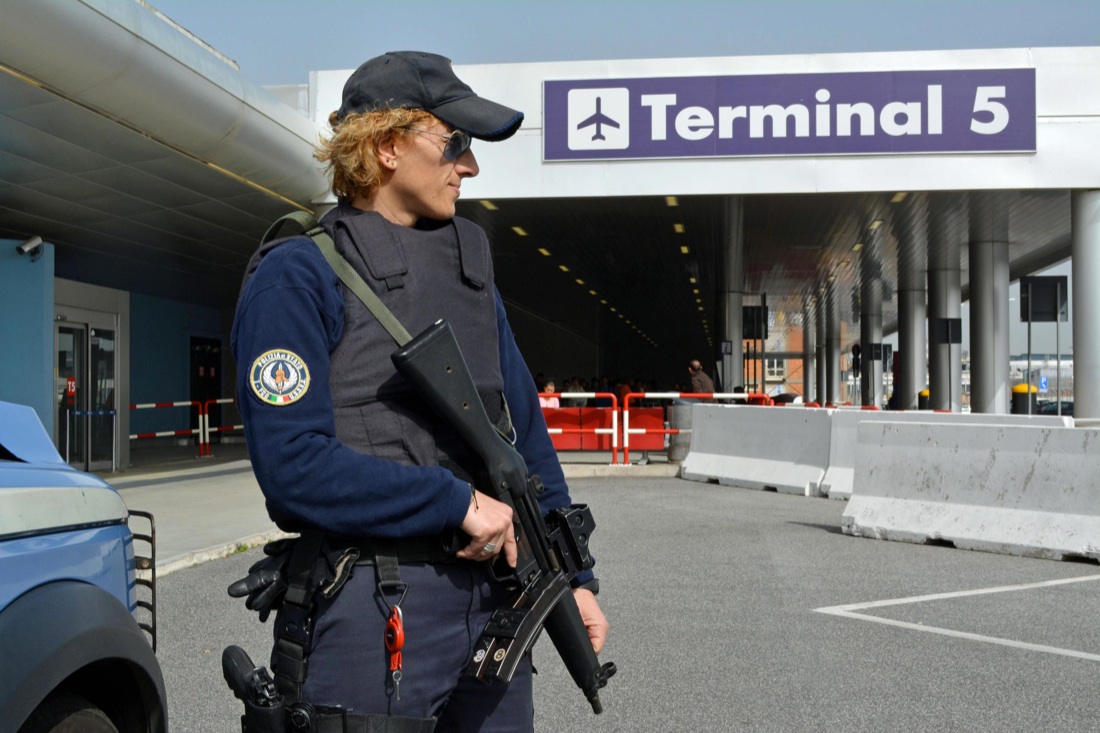 Controlli di sicurezza all’aeroporto di Fumicino, dopo le esplosioni all’aeroporto di Bruxelles, 22 marzo 2016