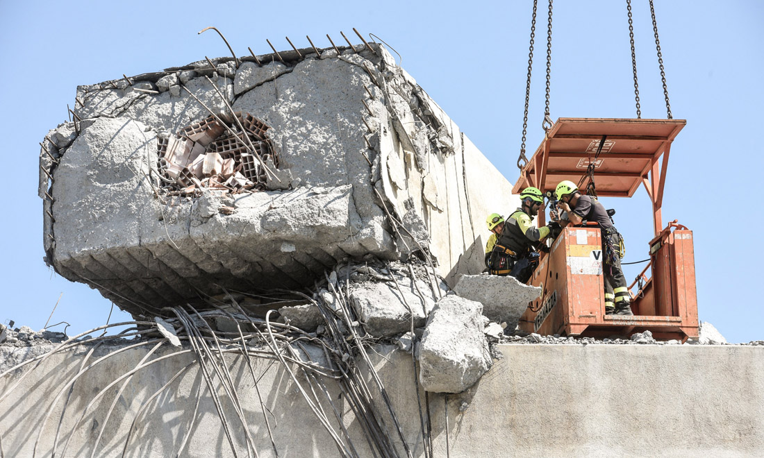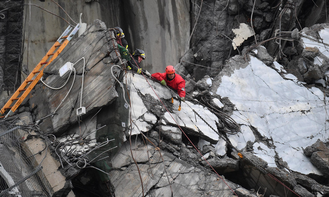 Soccorritori al lavoro per recuperare un ferito dopo il crollo del ponte Morandi, Genova, 14 agosto 2018.