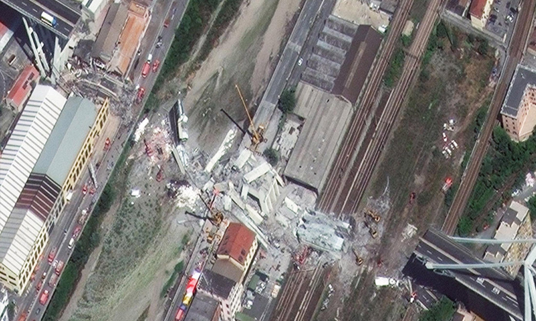 Un’immagine satellitare mostra il tratto di Ponte Morandi crollato, Genova, 15 agosto 2018.