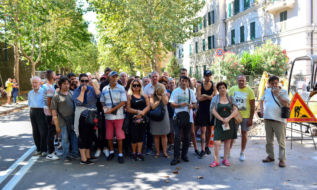 Alcuni degli oltre 500 residenti, evacuati da una dozzina di condomini situati sotto le estremità recise del ponte Morandi, si riuniscono a Genova il 15 agosto 2018, mentre aspettano di entrare nelle loro case per raccogliere i loro averi.
