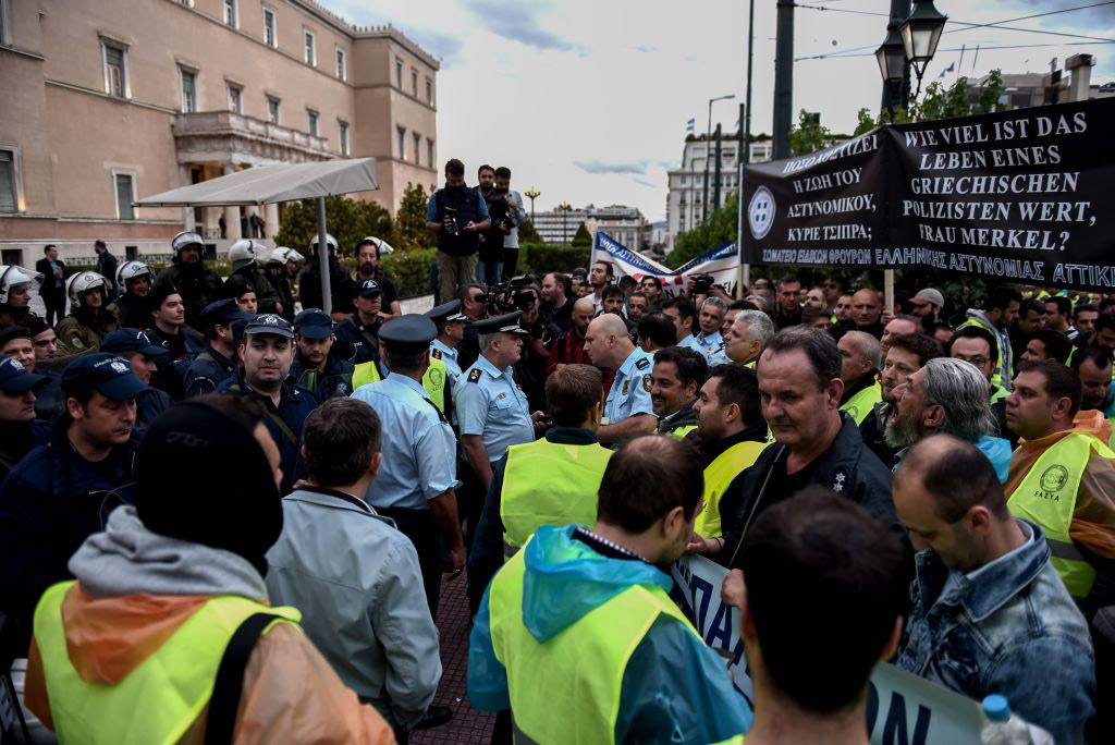 Gli agenti di polizia greci gridano slogan contro l’austerity fuori dall’Ufficio generale di contabilità – Atene, 17 maggio 2017