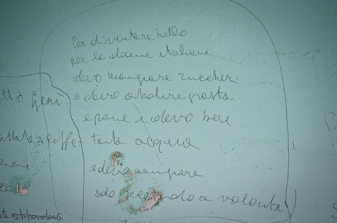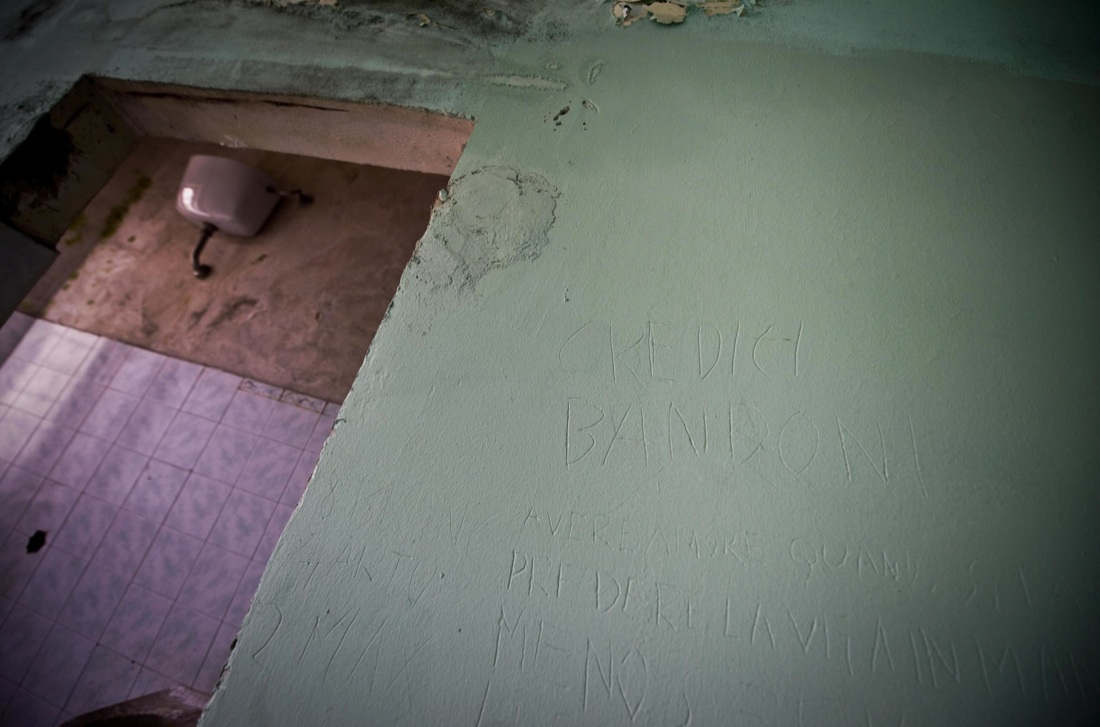 Scritte sui muri delle vecchie celle di isolamento, chiuse da anni, nell’ospedale psichiatrico giudiziaro (Opg) di Aversa, 17 aprile 2015. ANSA / CIRO FUSCO