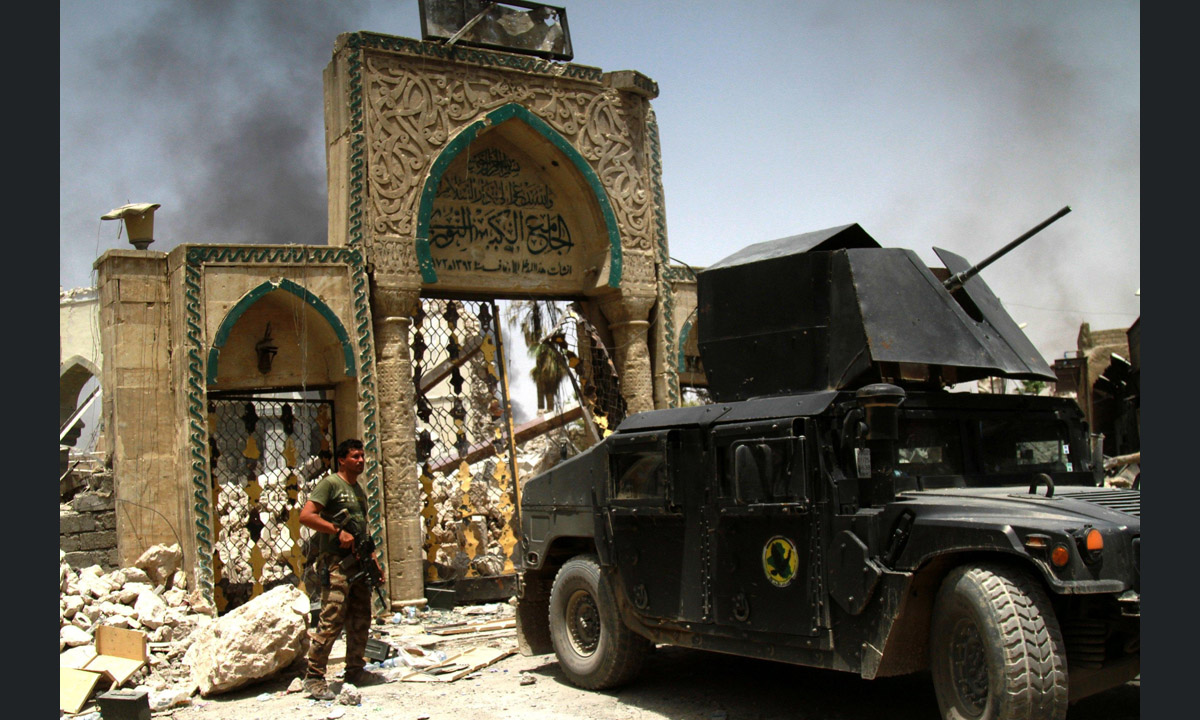 3 luglio 2017. Un soldato con un mezzo blindato accanto ai resti della moschea di Al Nuri, distrutta dai miliziani dell’Isis, e riconquistata dai soldati della coalizione antijihadista.