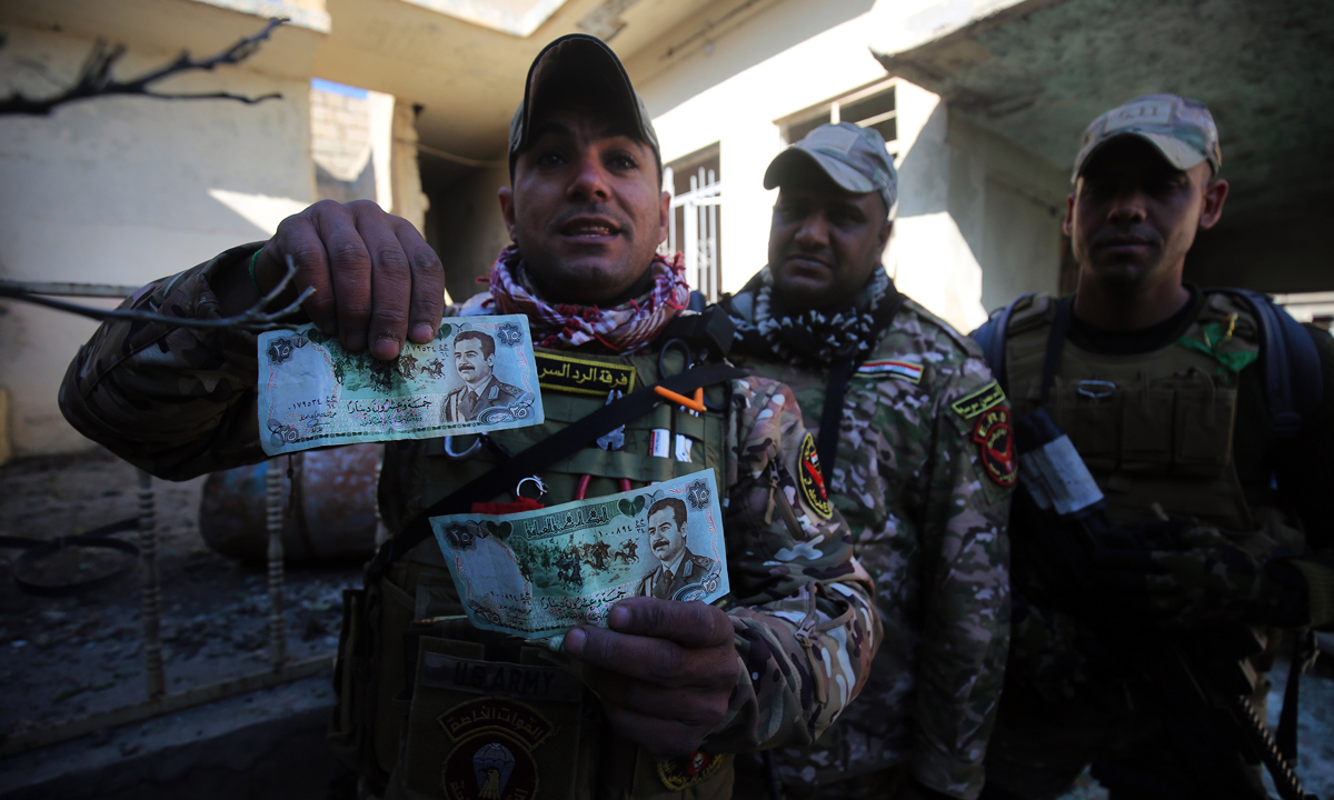 22 giugno 2017. Un agente della polizia irachena mostra una banconota da 10.000 dinari iracheni su cui è raffigurato il minareto pendente “Hadb” della moschea Al Nusra, edificio iconico di Mosul distrutto dall’Isis.