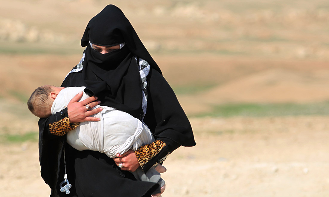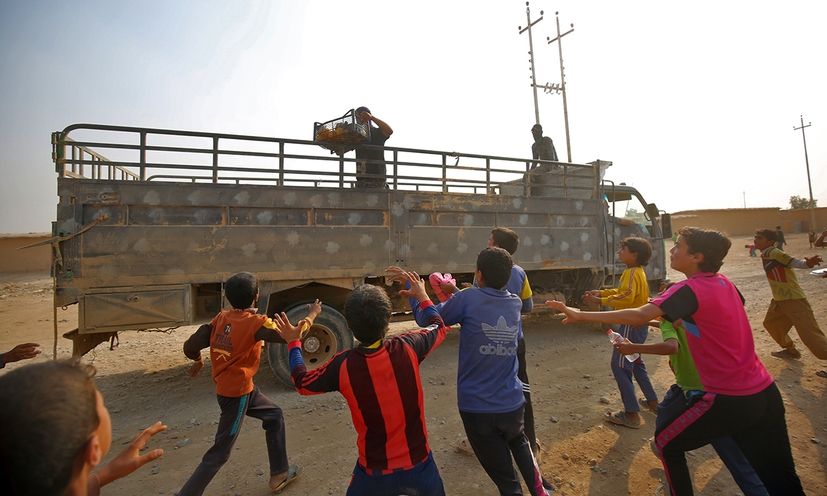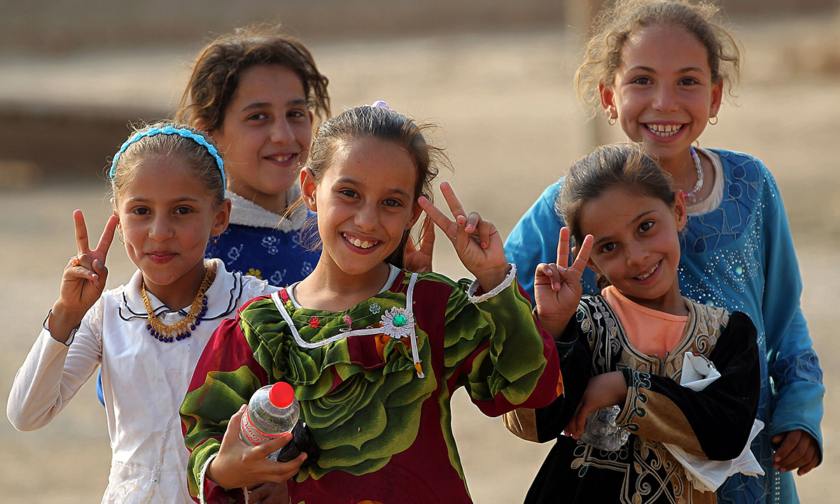 2 luglio 2017. Un gruppo di donne e bambini felici per la quasi definitiva riconquista della Città Vecchia a Mosul, in Iraq, sottratta al controllo dell’Isis.