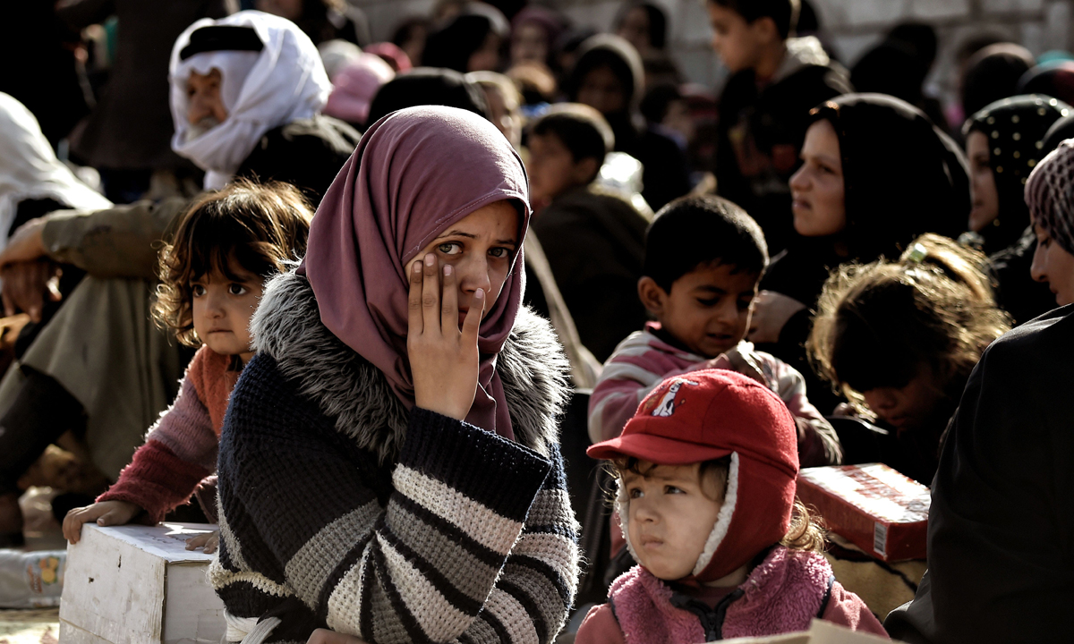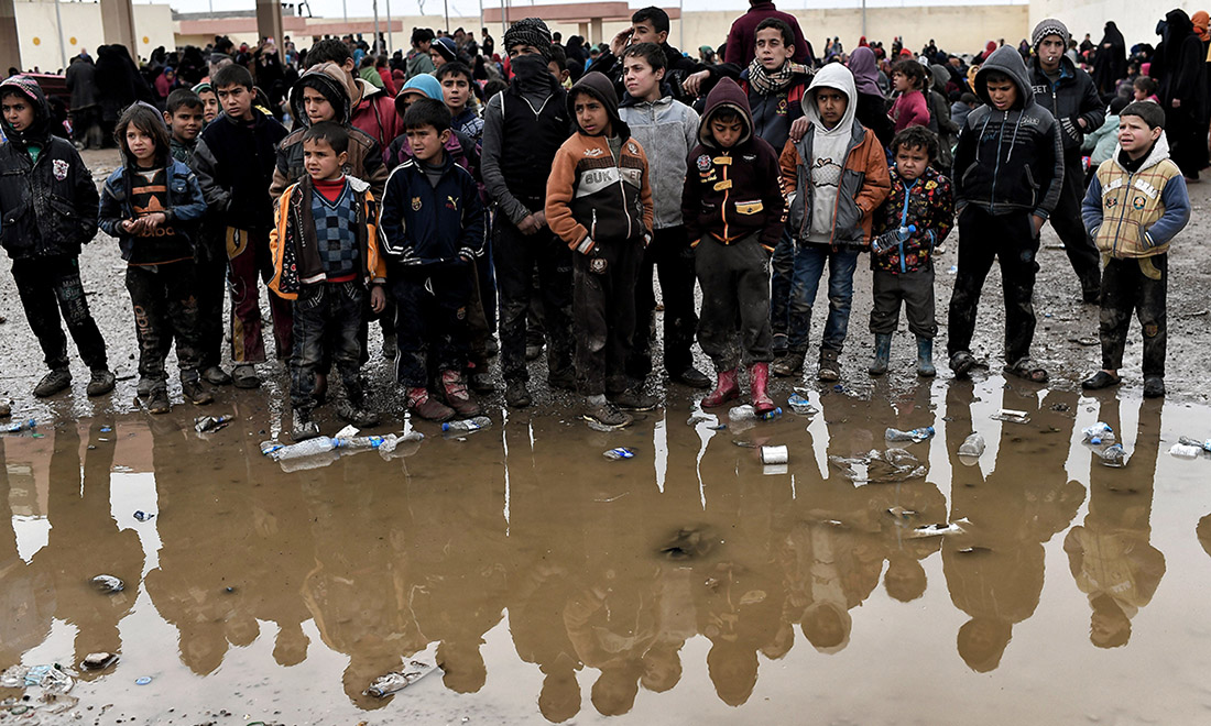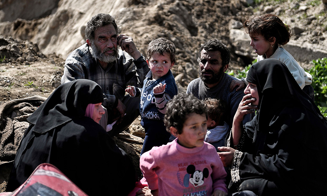 8 luglio 2017. Un gruppo di donne e bambini costretti a fuggire dalla Città Vecchia di Mosul nel distretto industriale occidentale, aspetta con i suoi familiari di poter fare ritorno a casa, dopo la definitiva sconfitta dell’Isis.