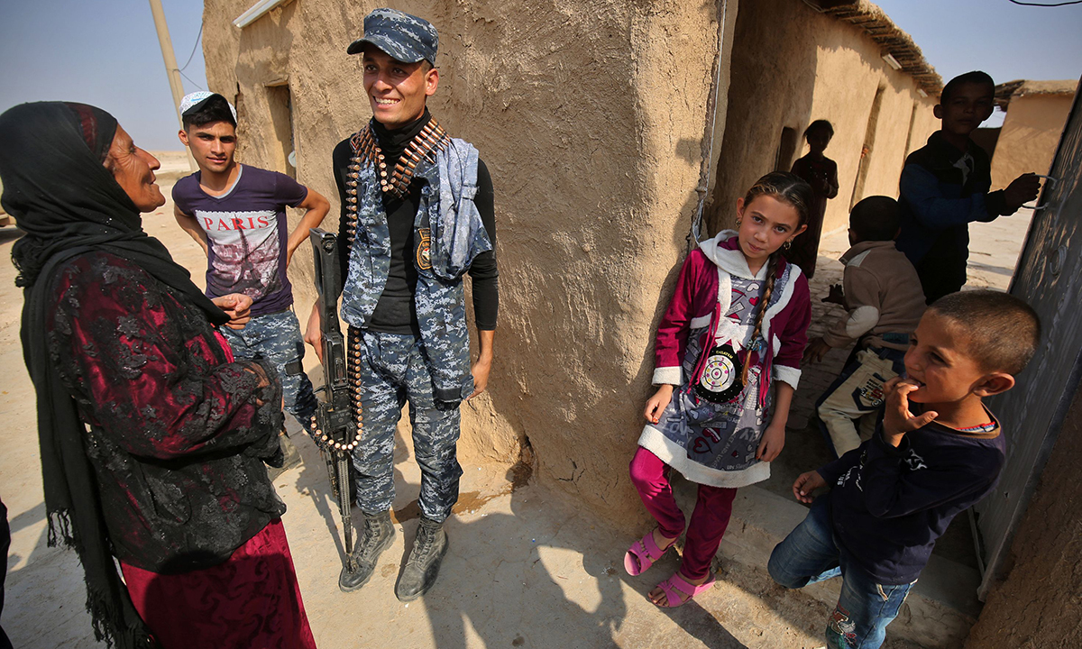 9 luglio 2017. Una bambina fa il segno della vittoria tra i soldati della polizia federale irachena, festeggiando la definitiva sconfitta dell’Isis a Mosul, in Iraq.