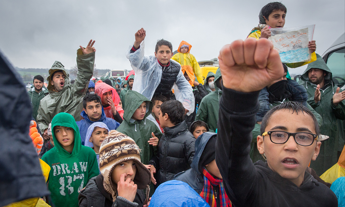 13 marzo 2016. Un momento della marcia di protesta organizzata dai migranti per chiedere l’apertura del confine tra Grecia e Macedonia, presso il campo di transito per rifugiati e migranti di Idomeni.