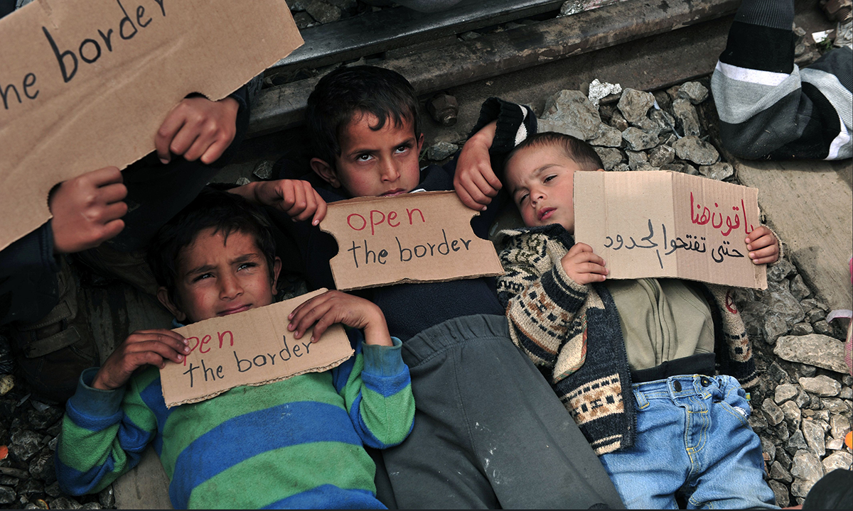 12 marzo 2016. Dei bambini sdraiati sui binari ferroviari mostrano cartelli su cui si legge “Aprite la frontiera” durante una manifestazione nei pressi del campo di transito per rifugiati e migranti di Idomeni, in Grecia, sul confine con la Macedonia.