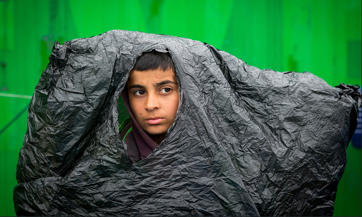 10 marzo 2016. Un bambino cammina sotto la pioggia nel campo di transito per rifugiati e migranti di Idomeni, in Grecia, sul confine con la Macedonia.