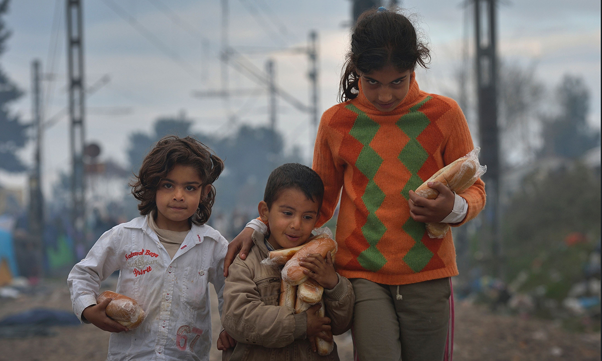 12 marzo 2016. Dei bambini camminano con del pane nelle mani nel campo di transito per rifugiati e migranti di Idomeni, in Grecia, sul confine con la Macedonia.