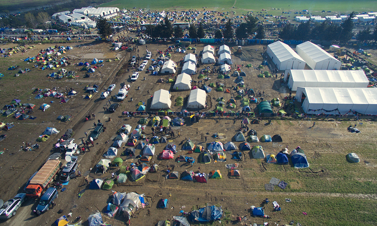 11 marzo 2016. Una veduta aerea del campo di transito per rifugiati e migranti di Idomeni, in Grecia, sul confine con la Macedonia.