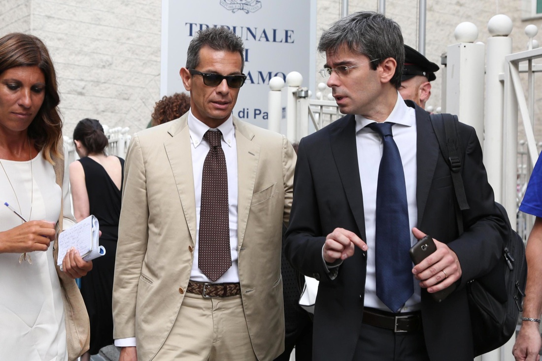 Il genetista Giorgio Portera (D), consulente della parte civile della famiglia con l’avvocato Enrico Pelillo (S) per l’ultima udienza del processo a carico di Massimo Bossetti per il quale sarà emessa la sentenza per l’omicidio di Yara Gambirasio, 1 luglio 2016