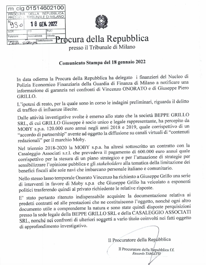 Un’altra tegola sul fondatore del Movimento Cinque Stelle. Beppe Grillo è indagato dalla procura di Milano per traffico di influenze illecite. Sotto la lente dei pm, una serie di trasferimenti in denaro e contratti pubblicitari tra il blog di Grillo e la compagnia marittima che fa capo all’armatore Vincenzo Onorato. Secondo i magistrati Onorato avrebbe chiesto a Grillo una serie di interventi a favore della sua azienda Moby: richieste che il leader avrebbe veicolato ad esponenti politici. Nel comunicato del procuratore di Milnao si legge che Grillo è indagato in quanto la sua società ha percepito da Moby spa 120 mila euro all’anno nel 2018 e nel 2019. Gli uffici dell’azienda di Grillo, che gestisce il suo sito, in queste ore sono stati perquisiti dalla guardia di Finanza di Milano.
