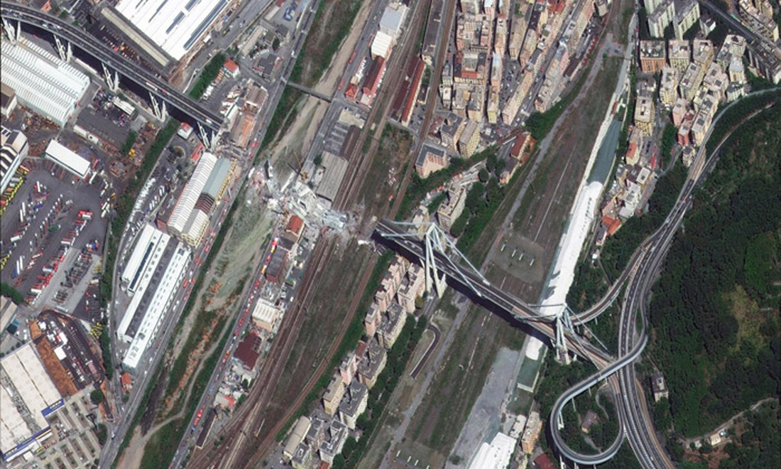 Un’immagine satellitare mostra il tratto di Ponte Morandi crollato, Genova, 15 agosto 2018.