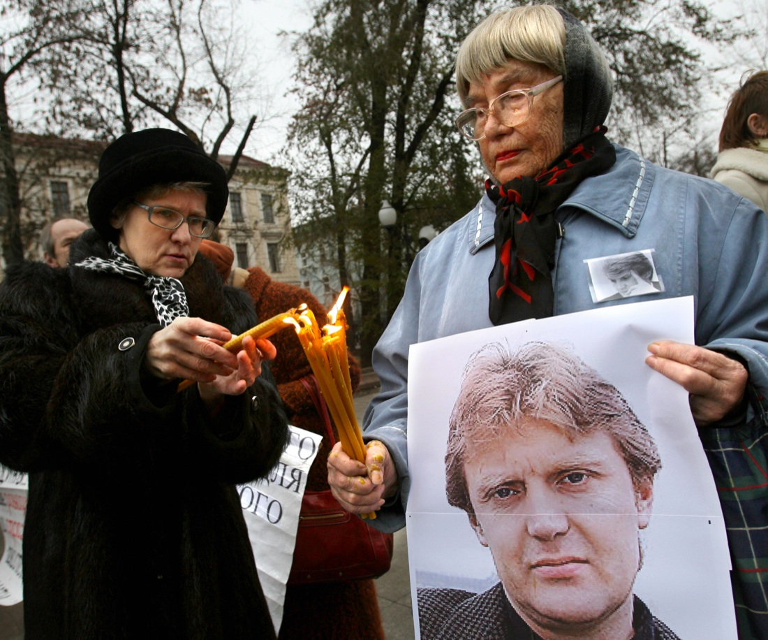 Due donne con un manifesto della ex spia russa Alexander Litvinenko avvelenata a Londra nel 2006, Mosca 22 novembre, 2008.