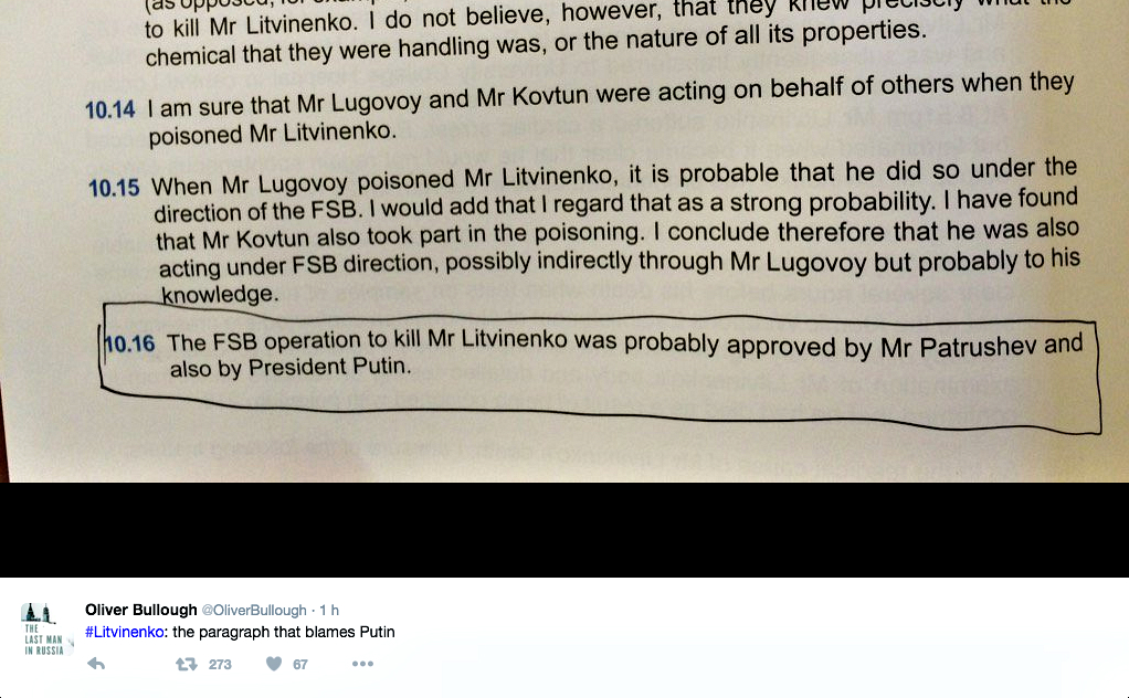“Sono sicuro che il signor Lugovoi e il signor Kovtun abbiano messo il polonio 210 nella teiera di Litvinenko al Pine Bar“, afferma oggi senza incertezze Owen. Ma le accuse a questi ‘comprimari’ scolorano di fronte a quelle rivolte ai sancta sanctorum del Cremlino. E – seppure in termini probabilistici – allo ‘zar’ in persona.