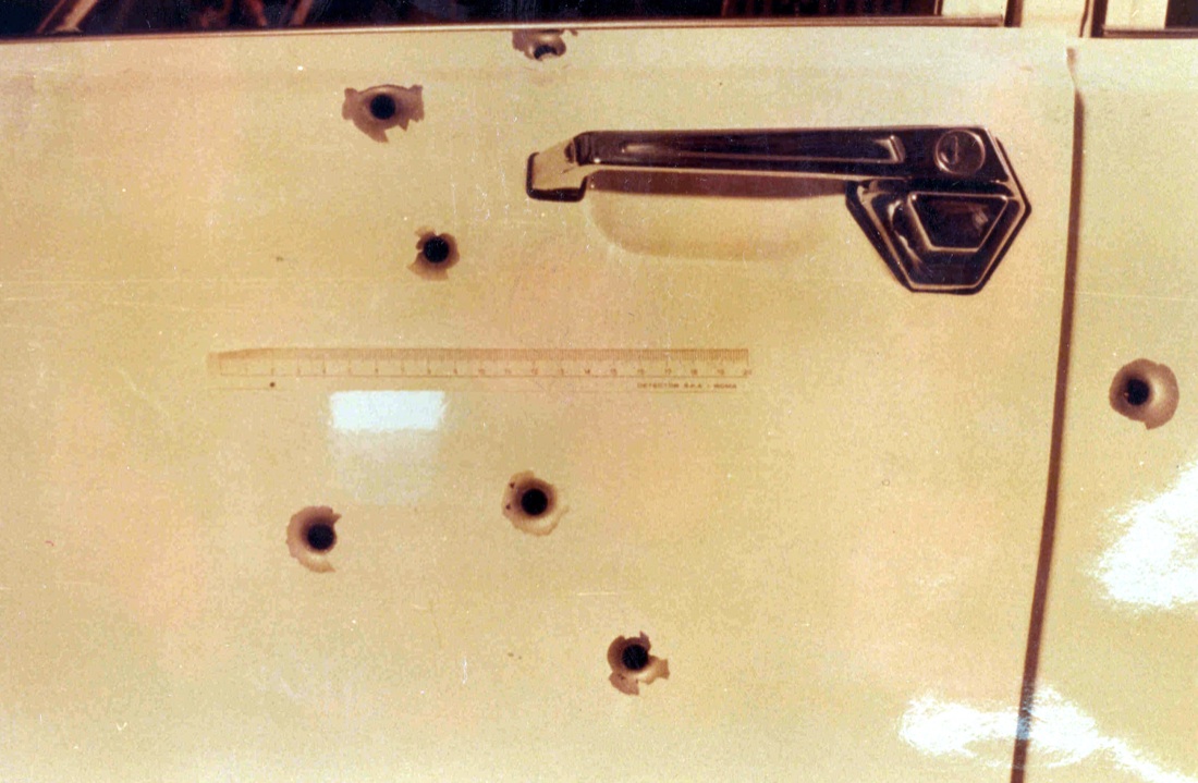 Particolare dei fori di proiettile in entrata nella facciata esterna della portiera anteriore sinistra dell’Alfetta della scorta.