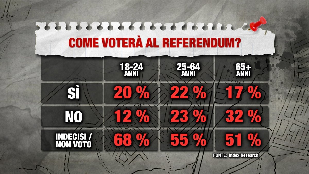 A rendere più complesso il quadro – e a far tirare un sospiro di sollievo ai fautori del Sì – c’è un ultimo sondaggio di Index Research per Piazzapulita che segnala un vantaggio piuttosto netto del Sì tra gli under 24, mentre il No prende il largo tra gli over 65.