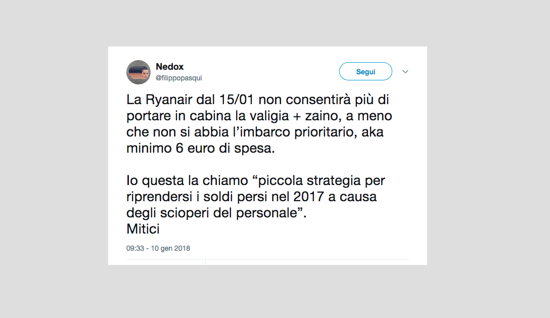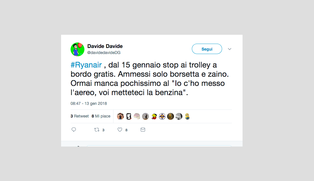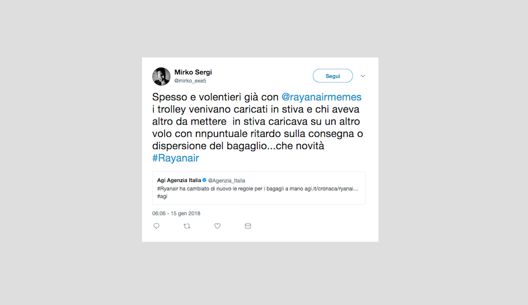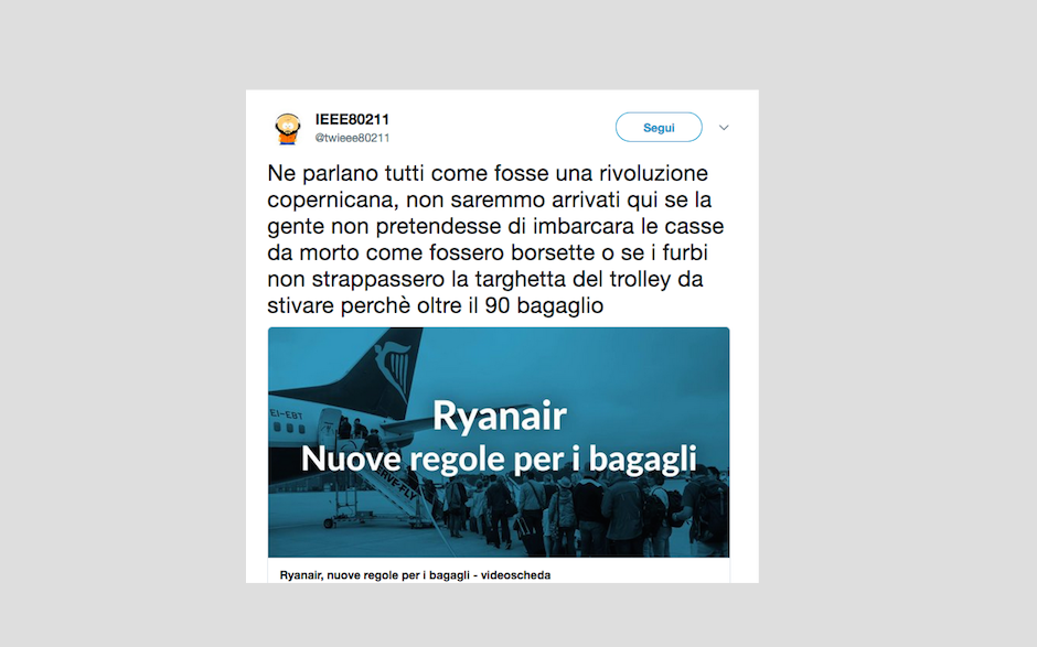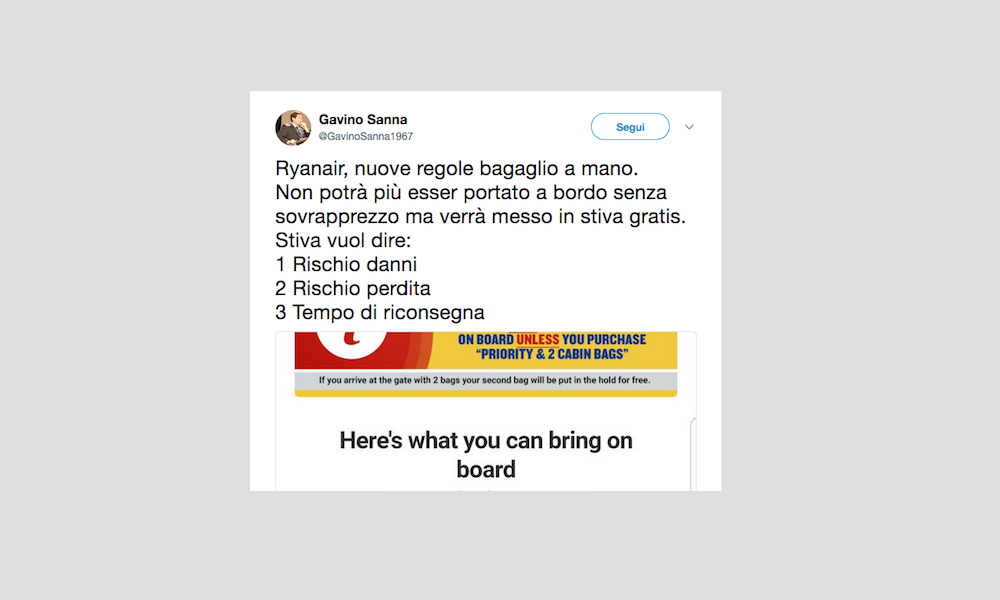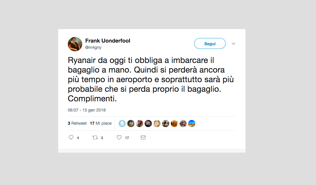 Le reazioni dei passeggeri alla notizia del nuovo regolamento di Ryanair che non permetterà più di portare due bagagli a mano gratis – 15 gennaio 2018