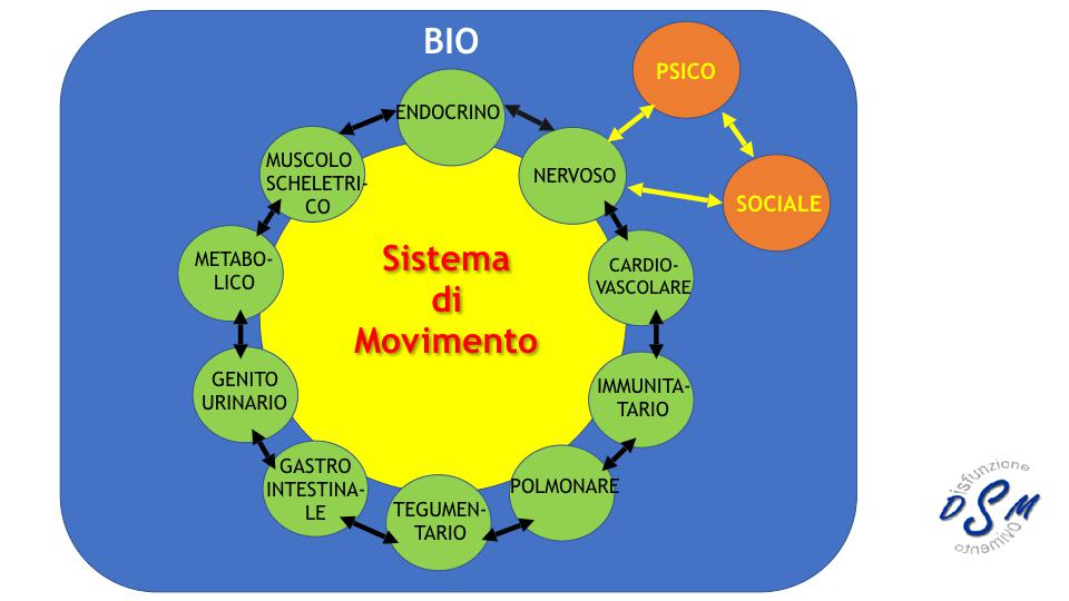 «Per spiegarlo, occorre prima conoscere cos’è il sistema di movimento. Secondo il Dizionario medico, il sistema di movimento umano è l’insieme degli organi fisiologici che interagiscono tra loro per produrre il movimento del corpo e delle sue parti. Il movimento è una funzione essenziale per la vita: gli ioni che attraversano le membrane cellulari sono movimenti, così come i nostri arti che si muovono nello spazio. Di questo insieme non fa parte solo il sistema muscolo-scheletrico o anche quello nervoso che dà gli impulsi ai muscoli. Quando compie un gesto, la persona esprime la sua personalità. Pensiamo al cammino, che rispecchia quello che noi siamo: per esempio un depresso cammina tutto racchiuso in se stesso… Quindi la persona non è solo bio, è anche psico. Ed è soprattutto un essere sociale. Perché la postura e il movimento non sono solo un banale allineamento di muscoli e articolazioni uno sopra l’altro, ma sono la sintesi di un vissuto, di una conoscenza sperimentata. Il sistema di movimento, quindi, riguarda tutto l’essere umano».