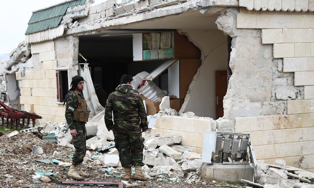 A nord di Azaz, ribelli siriani sostenuti dalla Turchia in piedi accanto a una struttura danneggiata, 5 febbraio 2018.