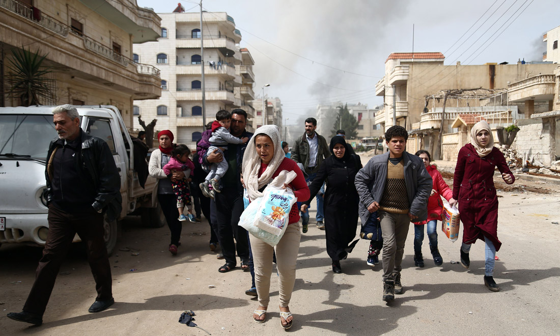 Civili siriani e combattenti ribelli evacuati da Ghouta orientale arrivano in un’area tenuta dal governo all’ingresso di Harasta, alla periferia della capitale Damasco, il 26 marzo 2018.